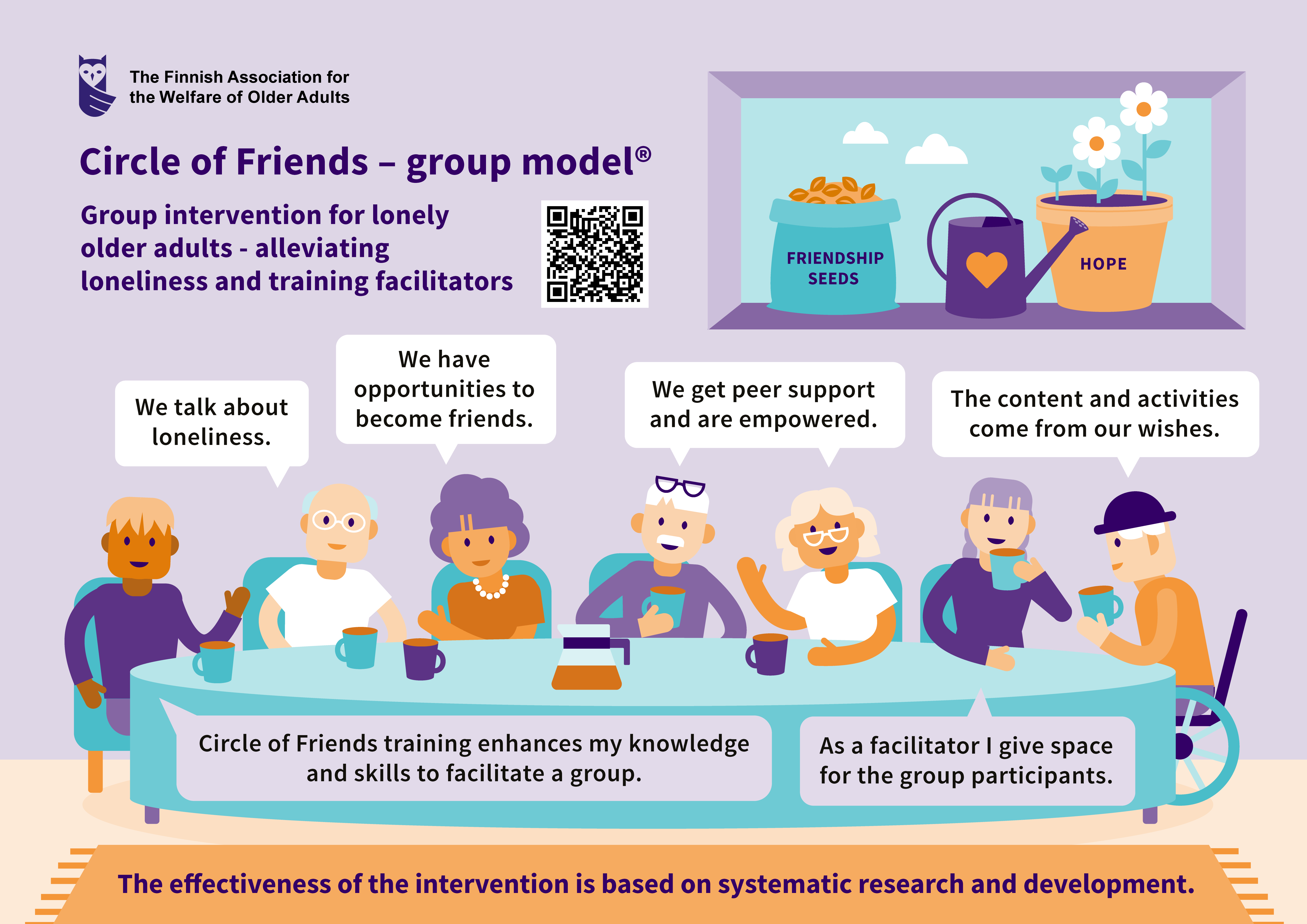 The Circle of Friends – group intervention for lonely older adults has been systematically and widely implemented and disseminated in Finland for 19 years. The main idea of the Circle of Friends group is to alleviate and prevent loneliness of older adults.
