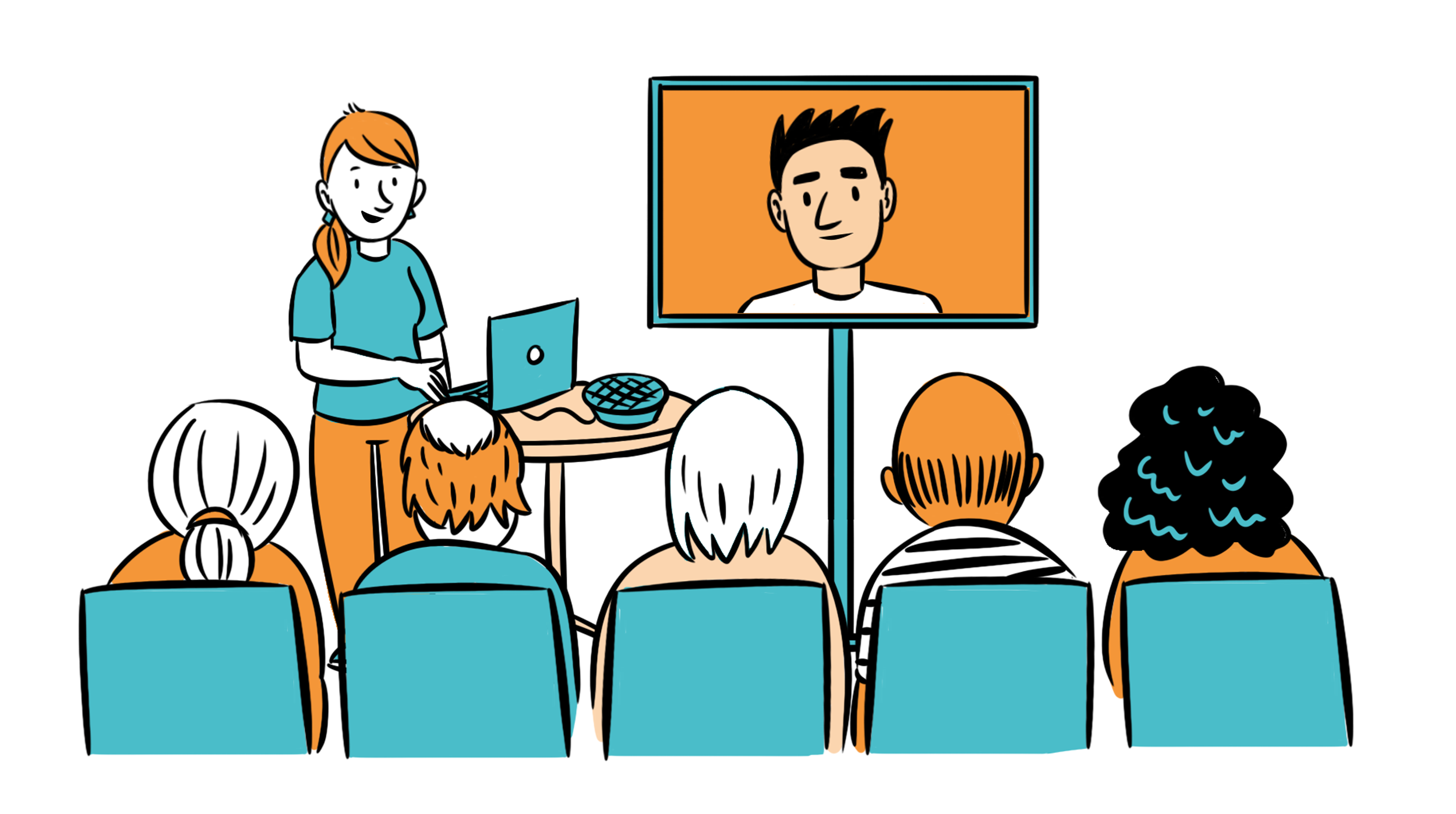 Etäkatsomon voi järjestää vaikka omassa olohuoneessa tai palvelutalon isossa salissa. Osallistujien kannalta kyseessä on oikeastaan ihan tavallinen tapahtuma, jossa yleisö saapuu yhteiseen tilaan seuraamaan esitystä tai osallistumaan harrastusryhmään. Vain esiintyjä on etänä.
