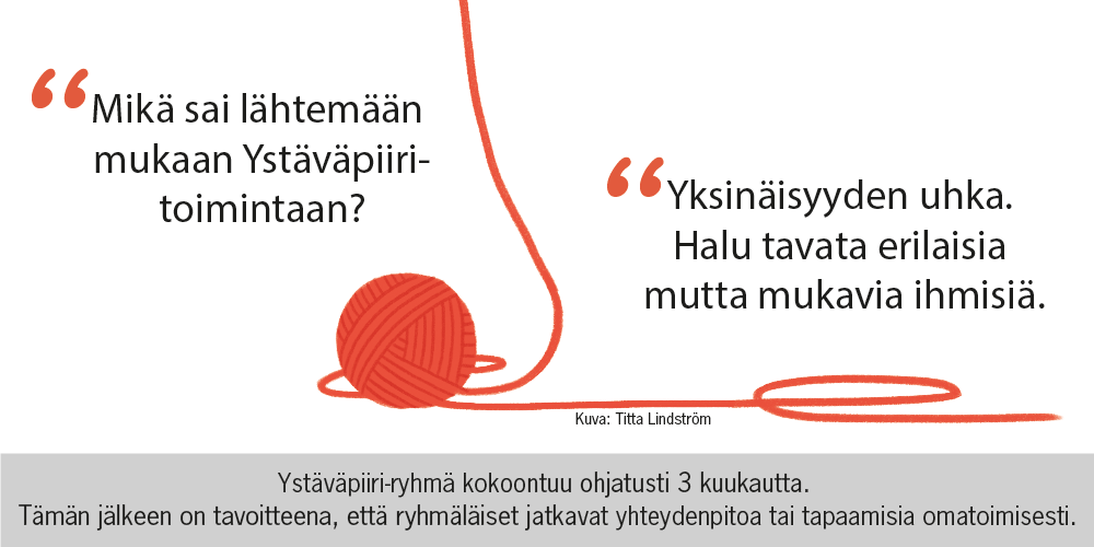 Yli 10 000 iäkästä ihmistä on saanut tukea yksinäisyyteensä Ystäväpiiri-ryhmissä ympäri Suomea. Ystäväpiiri-ryhmämalli on tutkittu, hyvinvointia ja terveyttä edistävä keino lievittää iäkkäiden ihmisten yksinäisyyttä. Korona-aikana ryhmiä toteutetaan myös verkossa.