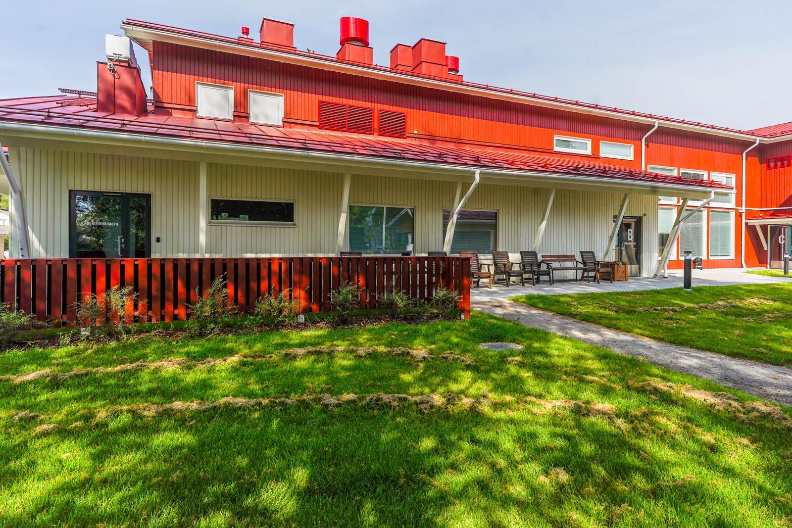 Rakennukset ovat lautaverhoiltuja ja väritykseltään punakeltaisia. Ne istuvat kotoisasti tontin ympäristöön, eivätkä näytä laitosmaisilta.