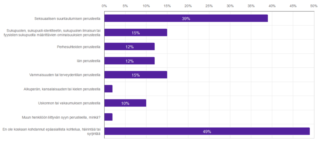 39 prosenttia vastaajista oli kohdannut syrjintää seksuaalisen suuntautumisen perusteella ja 15 prosenttia sukupuolen, sukupuoli-identiteetin, sukupuolen ilmaisun tai fyysisten sukupuolta määrittävien ominaisuuksien perusteella. Iän tai perhesuhteiden perusteella syrjintää oli kohdannut 12 prosenttia ja 15 prosenttia vammaisuuden tai terveydentilan perusteella. Joka kymmenes oli kohdannut syrjintää uskonnon tai vakaumuksen perusteella. Puolet vastaajista (49 %) ei ole koskaan kohdannut epäasiallista kohtelua, häirintää tai syrjintää. Noin puolella vastaajista (52 %) viimeisimmästä syrjintäkokemuksesta oli korkeintaan vuosi, kun taas toisella puolella (48 %) edellisestä kokemuksesta oli useita vuosia.