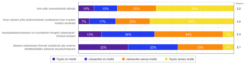 Puolet vastaajista (49 %) ei kokenut asuinpaikkakunnassaan olevan myönteinen ilmapiiri sateenkaari-ihmisiä kohtaan (täysin tai jokseenkin eri mieltä). Vain alle 10 prosenttia vastaajista (7 %) oli täysin samaa mieltä väittämän kanssa. Yli puolet vastaajista (64 %) olivat eri mieltä väittämän ”Ikäiseni sateenkaari-ihmiset uskaltautuvat olla avoimia identiteetistään julkisesti asuinkunnassani” -kanssa. Vain 7 prosenttia oli täysin samaa mieltä.