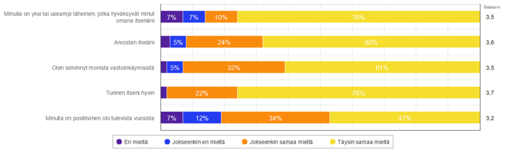 Lähes kaikki vastaajat (98 %) kokivat tuntevansa itsensä hyvin (täysin tai jokseenkin samaa mieltä). Lisäksi valtaosa vastaajista vastasi selvinneensä monista vastoinkäymisistä (93 %) ja arvostavansa itseään (92 %) (täysin tai jokseenkin samaa mieltä). 81 prosentilla on positiivinen olo tulevista vuosista (täysin tai jokseenkin samaa mieltä), mutta viidennes (19 %) oli väittämän kanssa täysin tai jokseenkin eri mieltä. Selvällä enemmistöllä vastaajista (86 %) on yksi tai useampi läheinen, jotka hyväksyvät sateenkaariseniorin omana itsenenä (täysin tai jokseenkin samaa mieltä). 14 prosenttia vastaajista oli väittämän kanssa eri mieltä eli tällaista läheistä ei välttämättä ole.