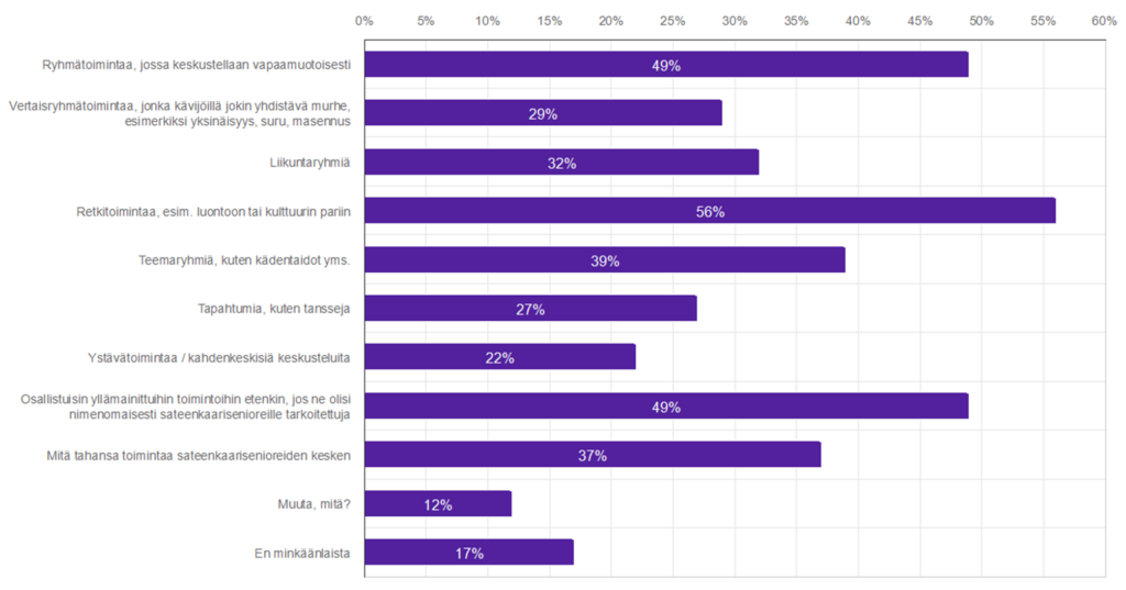 Kyselyllä haluttiin saada tieto myös Pohjois-Pohjanmaalla asuvien sateenkaarisenioreiden tarpeista ja toiveista palveluille sekä erilaisille sosiaalisen tuen muodoille. Vastaajilta kysyttiin, millaista toimintaa omaan asuinkuntaan kaivataan (Taulukko 4). Puolet vastaajista (56 %) kaipaa erityisesti retkitoimintaa, esimerkiksi luonnon tai kulttuurin pariin. Toiseksi eniten vastauksia (49 %) sai ryhmätoiminta, jossa keskusteltaisiin vapaamuotoisesti. Myös teemaryhmät (kädentaidot yms.) (39 %), liikuntaryhmät (32 %) sekä vertaisryhmät, joissa kävijöillä on jokin yhdistävä murhe (esim. suru tai yksinäisyys) (29 %) nousivat vastausvaihtoehdoissa esille. Puolet vastaajista (49 %) vastasi osallistuvansa toimintaan etenkin, jos se olisi nimenomaisesti sateenkaarisenioreille tarkoitettua. 37 prosenttia kaipaisi mitä tahansa toimintaa sateenkaarisenioreiden kesken. Tämä näkemys vahvistui haastatteluissa, joissa haastateltavat kertoivat kaipaavansa nimenomaan seuraa muista sateenkaari-ihmisistä ja vertaistukea.