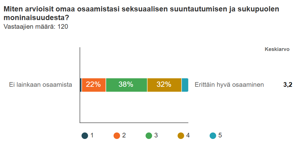 Vastaajista 28 prosenttia kertoi saaneensa koulutusta seksuaalisen suuntautumisen ja sukupuolen moninaisuudesta, ja 13 prosenttia sateenkaarisenioreiden kohtaamisesta. Vastaajista 24 % piti omaa osaamistaan teemoista vähäisenä (arvot 1 ja 2, taulukko 1). Vastaajista yli puolet (60 %) kertoi olevansa kiinnostunut lisäämään omaa osaamistaan seksuaalisen suuntautumisen ja sukupuolen moninaisuudesta. Kyselyssä myös kartoitettiin, miten hyvin vastaajat tunsivat seksuaalisen suuntautumisen ja sukupuolen moninaisuutta kuvaavia termejä. Valtaosalle termit olivat tuttuja. Vähiten tuttuja olivat termit intersukupuolinen (45 %), cissukupuolinen (35 %) ja panseksuaali (48 %).