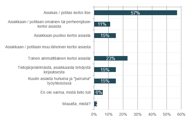 Vastaajista 39 prosentilla oli asiakkaana sateenkaarisenioreita. Vastaajilta kysyttiin, mistä he olivat saaneet tiedon asiakkaan seksuaali- ja/tai sukupuolivähemmistöön kuulumisesta. Vastaajista 57 prosenttia kertoi, että asiakas/potilas oli itse kertonut asiasta ja 23 prosenttia kertoi toisen ammattilaisen kertoneen asiasta. Osa vastasi, että oli kuullut asiasta huhupuheena tai saanut tiedon asiakkaasta tehdystä kirjauksesta tietojärjestelmässä (taulukko 2).