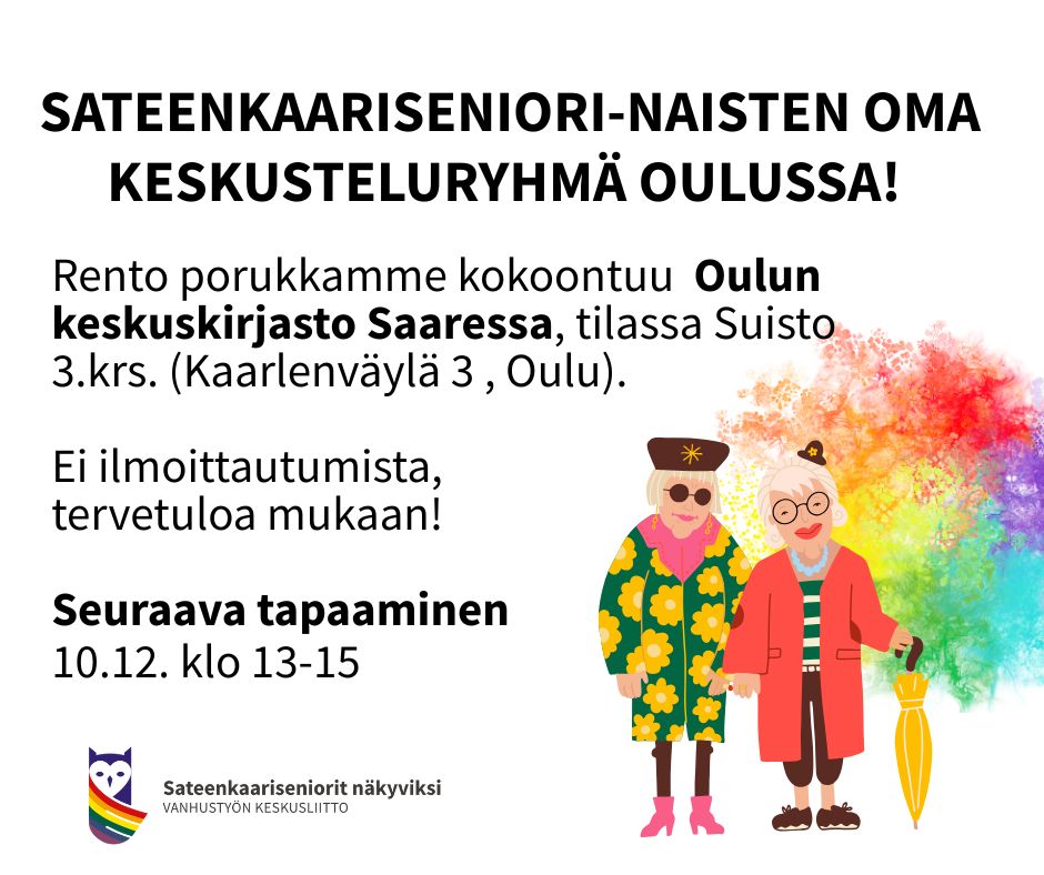 Toivottu sateenkaariseniori-naisten oma ryhmä aloittaa Oulussa. Ryhmä kokoontuu vuoden 2025 puolella kaksi kertaa 19.11 klo 13–15 ja 10.12. klo 13–15.