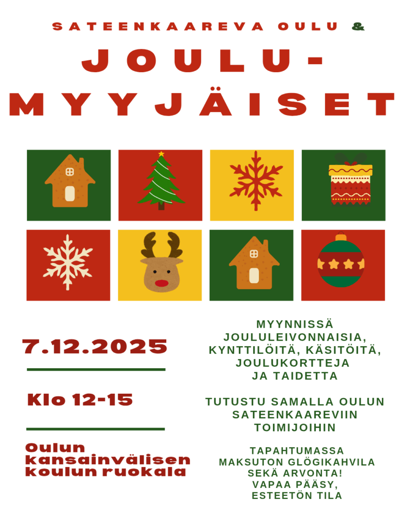Tervetuloa joulumyyjäisiin Oulun kansainväliselle koululle sunnuntaina 7.12. klo 12-15. Tapahtuma on kävijöille ilmainen, kaikille ja kaiken ikäisille avoin. Myyjäisten lisäksi tapahtumassa on oiva tilaisuus tutustua alueen upeisiin sateenkaareviin toimijoihin. Sateenkaariseniorit näkyviksi -hanke on luonnollisesti tapahtumassa mukana!