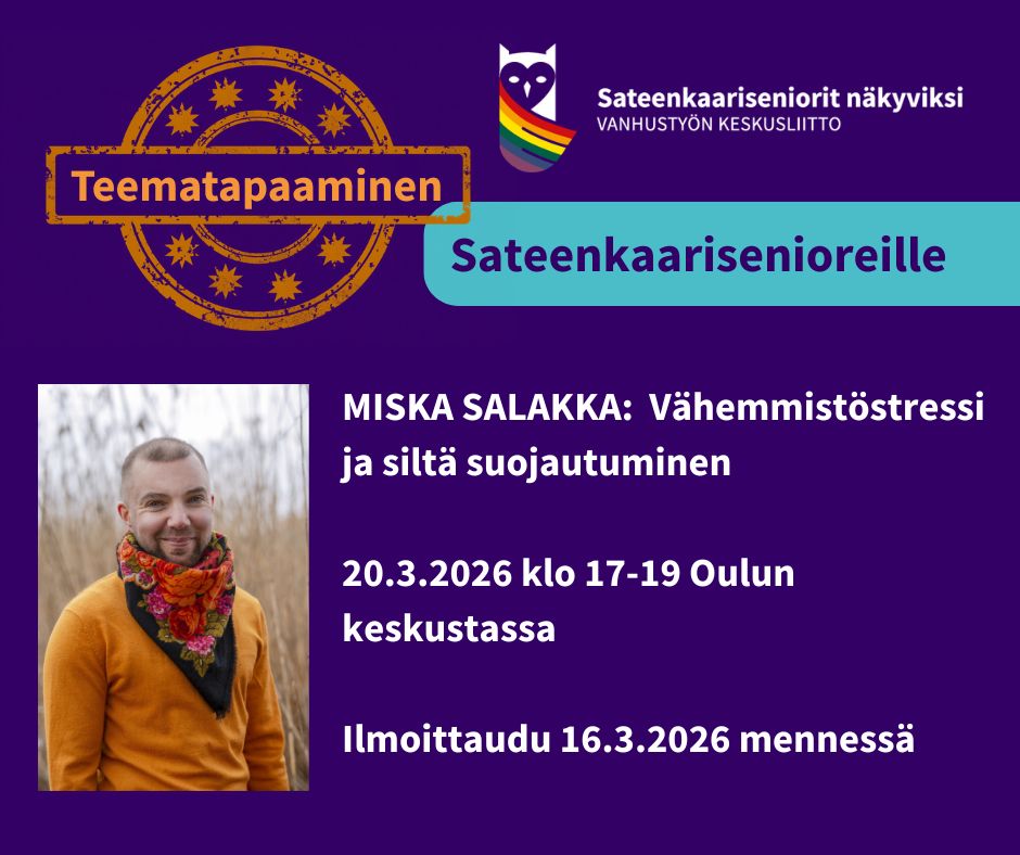 Tapaamisessa kuulet lisää vähemmistöstressistä sekä pääset keskustelemaan vertaisten kanssa aihepiiristä. Keskustelemme myös vähemmistöstressin vastavoimista, kuten yhteisöllisyydestä, arvoista ja omannäköisen elämän rakentamisesta.