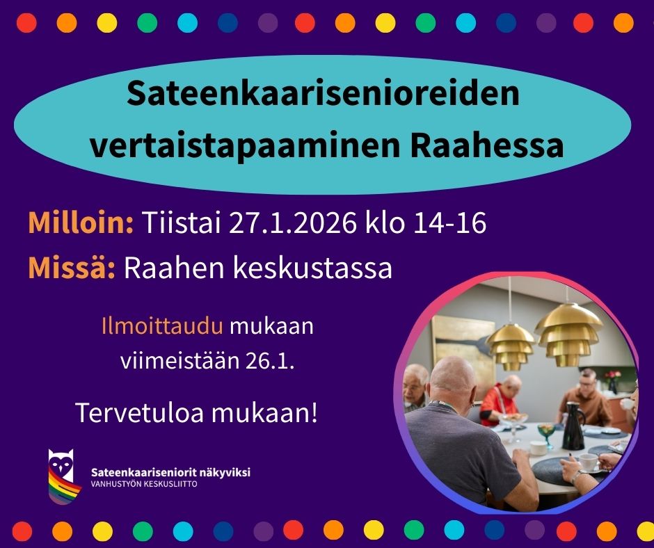 Tervetuloa mukaan sateenkaarisenioreiden vertaistapaamiseen tiistaina 27.1.2026 klo 14-16 Raahessa. Tapaamisessa luvassa mukavaa yhdessäoloa, keskustelua ja kahvittelua.