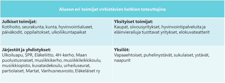 Hoivakodin arjessa virkistäviä ja toimintakykyä ylläpitäviä hetkiä voidaan toteuttaa palveluita järjestävän organisaation henkilökunnan toimesta, mutta myös alueellisena yhteistyönä. Keskustelutapaamisissa tunnistettiin, että erilaisten hetkien toteuttajia voivat olla julkiset toimijat, yksityiset toimijat eri aloilta sekä erilaiset järjestöt ja yhdistykset. Toimijat voivat olla eri ikäisiä, lapsista eläkeläisiin. Myös vapaaehtoistyö sekä ystävien ja sukulaisten kanssa vietetty aika koettiin tärkeäksi.