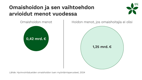 Terveyden ja hyvinvoinnin laitoksen (THL) raportissa (Ilmarinen ym. 2024) arvioitiin aikuisten omaishoidon vaihtoehtoisia kustannuksia eli sitä, kuinka paljon hoidon menot olisivat ilman omaishoitoa. Hyvinvointialueiden antaman arvion mukaan omaishoidolla korvataan intensiivistä kotihoitoa ja ympärivuorokautista hoitoa. Vaihtoehtoisen hoivan kustannukset olisivat noin 1,25 miljardia euroa, kun omaishoidon kustannukset ovat noin 418 miljoonaa euroa (kuvio 1). Ero on kolminkertainen.